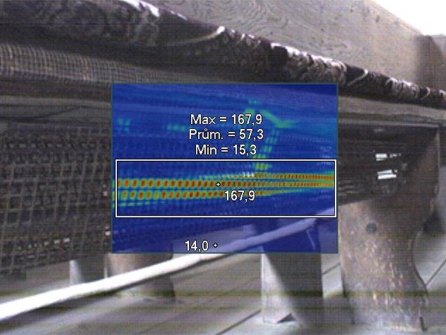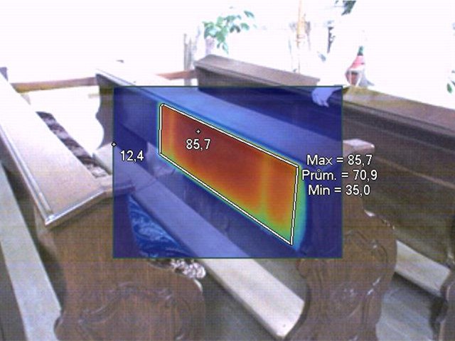 Oba panely a jedna sekce stávajícího vytápění byly uvedeny do provozu. Po hodině nepřerušovaného chodu bylo provedeno měření oteplení topných těles pomocí infrakamery a byl zhodnocen i subjektivní pocit tepelné pohody jednotlivými účastníky testu. Test byl prováděn při teplotě vzduchu cca 12°C.