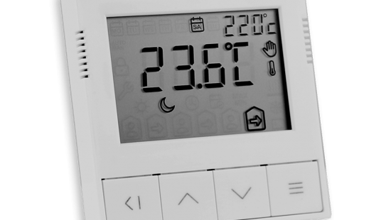 LCD display 2,8" (bez podsvícení), uživatelsky volitelné snímaní teplot - jen prostoru, podlahy, nebo obou hodnot. Týdenní program - až 6 teplotních změn denně mezi přednastavenou komfortní a útlumovou teplotou, režim ručního ovládání, režim protimrazové ochrany (5°C). Možnost softwarového vypnutí termostatu, volitelná funkce "Detekce otevřeného okna", možnost uzamčení ovládání (tzv. dětský zámek).