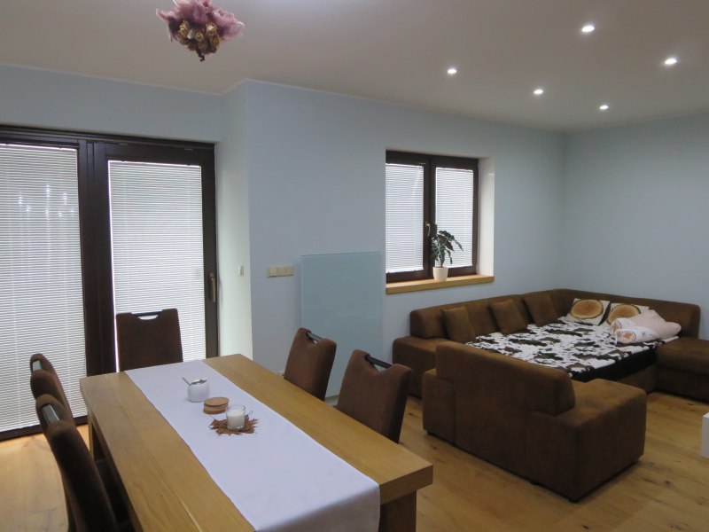 Obývací pokoj má pod plovoucí podlahou topné folie ECOFILM, potřebný příkon je doplňuje skleněný sálavý panel GR v bílé barvě skla
