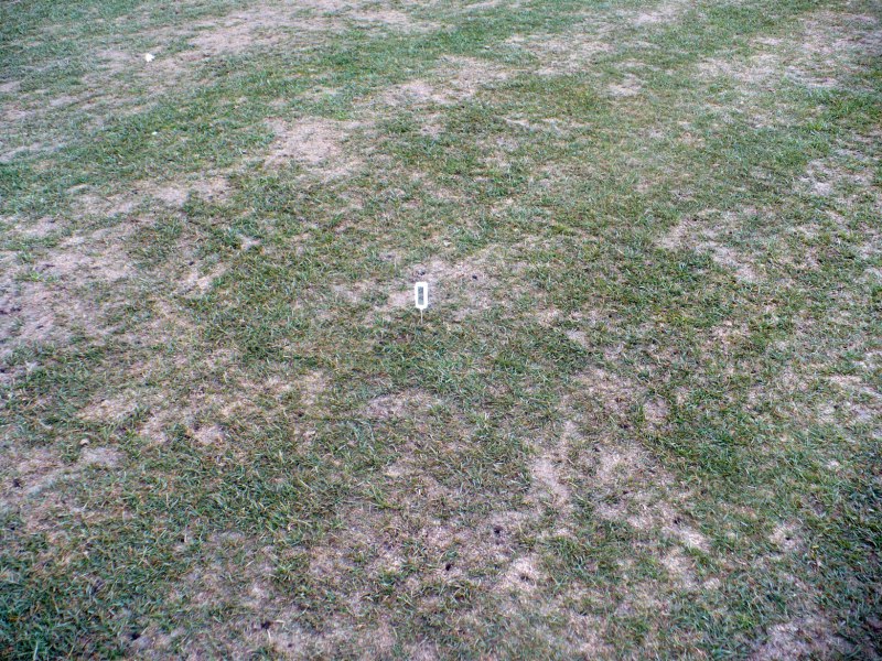 A toto je nevyhřívaný trávník za jednou z branek (jeho teplota byla jen 2°C). Celkový pohled na hrací plochu (vpravo nevytápěný trávník za brankou). Patrný rozdíl je ve vzhledu trávníku, ale zejména v tvrdosti povrchu.