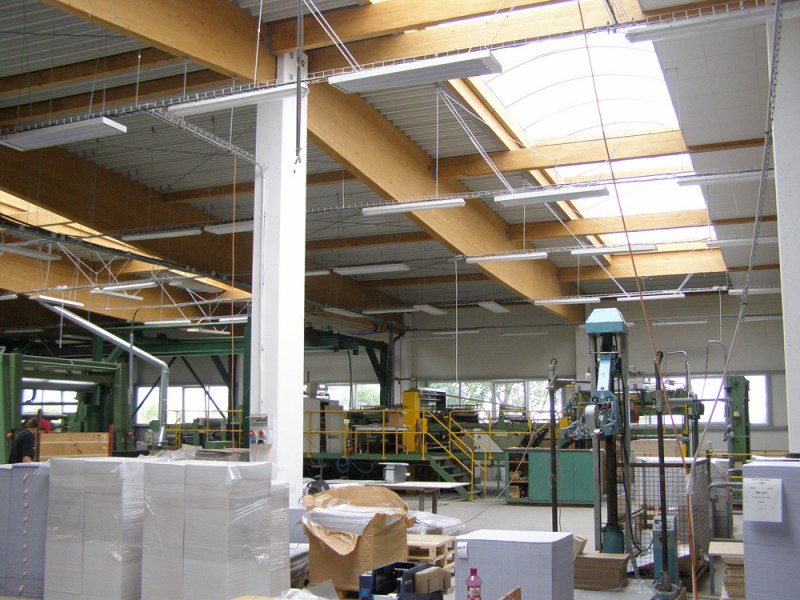 V nové výrobní hale byly instalovány vysokoteplotní sálavé panely ECOSUN S 36. Sálavé vytápění je u objektů s velkou světlou výškou výrazně efektivnější a úspornější než klasické konvekční systémy. Tento systém navíc nevyvolává samovolnou cirkulaci vzduchu, což je vzhledem ke zvýšené prašnosti provozu při zpracování papíru nezanedbatelnou výhodou.