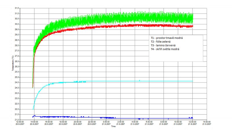 Počítačovou simulaci i naše měření jsme si porovnali v grafu, a zjistili jsme, že teploty ověřené praktickým měřením jsou nepatrně vyšší. Positivní je však vývoj teplot u obou způsobů, který se vyvíjel obdobně - souběžně.